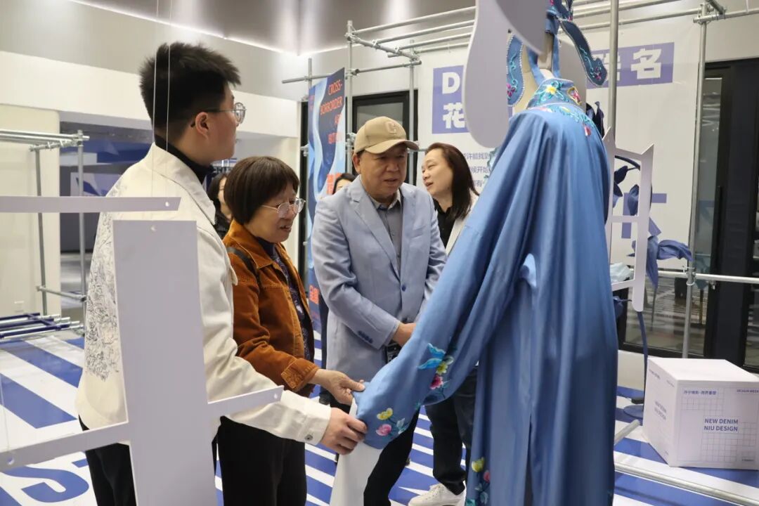 在均安牛仔设计城时尚创展厅内,深圳市纺织行业协会会长马浩然、香港青少年中華文化交流協會顾问陈茜微等领导对牛仔与书法、戏服、文创、醒狮等结合颇感兴趣,纷纷驻足研究。